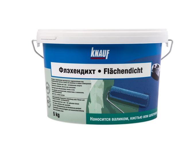 • КНАУФ-Флэхендихт представляет собой водную дисперсию синтетического латекса и инертных заполнителей, голубого цвета, используемую для гидроизоляции поверхностей стен и пола внутри зданий. Не содержит растворителей. имеет главное предназначение обрабатывать поверхности перед тем как на них будет нанесен слой гидроизоляционного материала. Knauf flachendicht проявляет хорошую адгезию с большинством оснований. Для примера можно взять покрытия из бетона, гипсовой и цементной штукатурки, дерева, пенопласта, металла, а также покрытие облицованное плиткой. Кнауф мастика это абсолютно безвредный материал для человека, который не имеет специфического запаха.